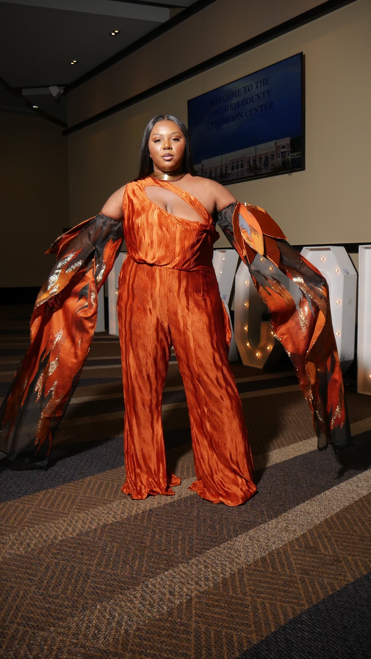 Make a bold statement in the BLAZE jumpsuit, featuring a wide-leg bell bottom silhouette that moves with you. The one-shoulder design and chest cutout add daring allure, while sheer detached sleeves adorned with delicate 3D petals lend a touch of elegance and uniqueness. Perfect for occasions when you want to stand out effortlessly.