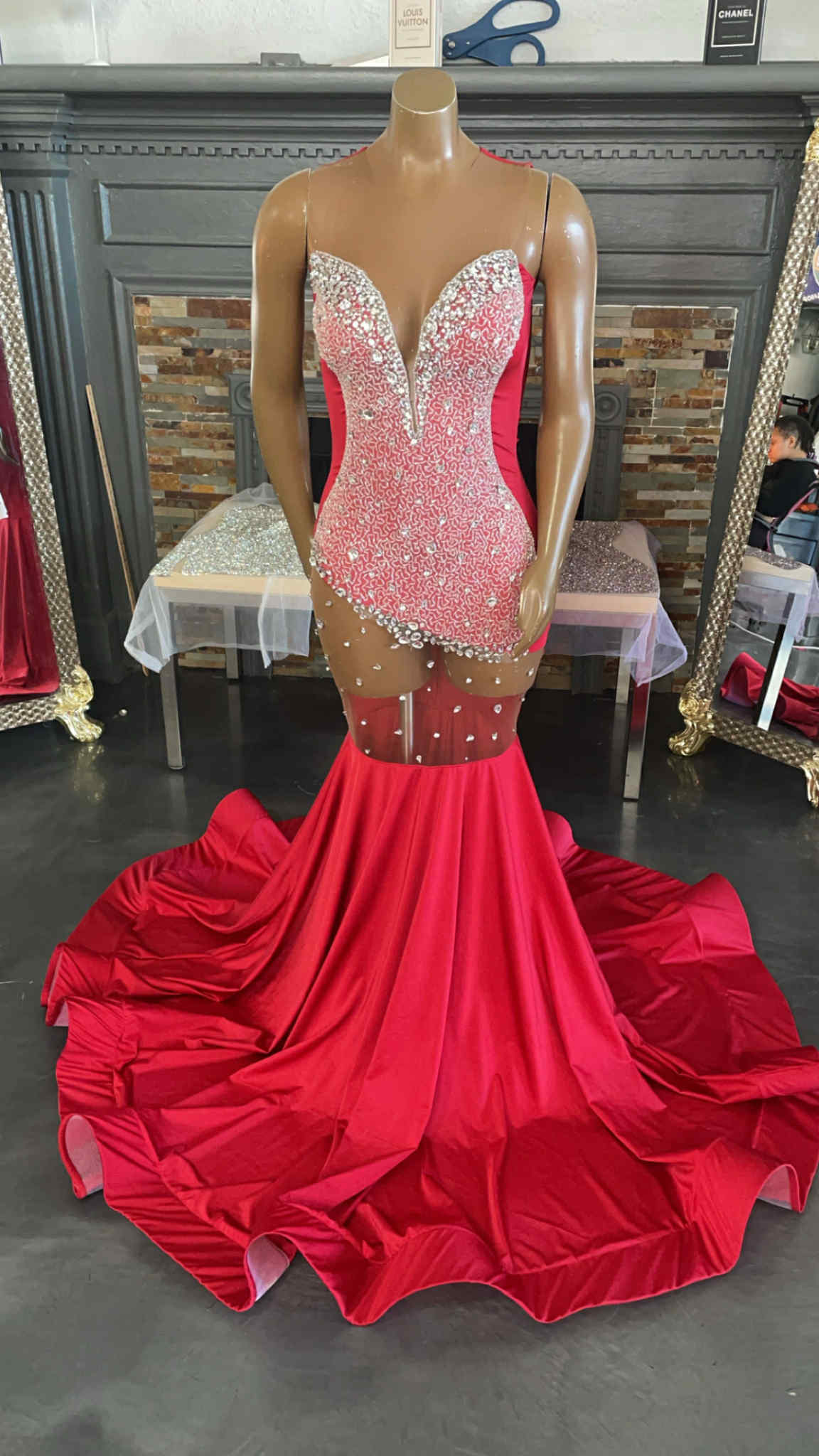 Turn heads effortlessly in this striking red mermaid gown featuring elegant silver rhinestone detailing that adds just the right amount of sparkle. The asymmetrical cut enhances your silhouette for a sophisticated, modern look that flatters every curve. Perfect for making a bold statement at any special occasion.